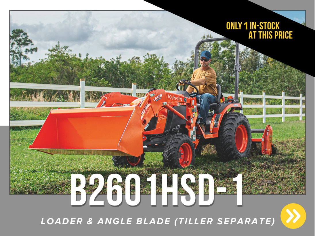 *Customer instant rebates of $5,000 are available on qualifying finance or cash purchases or B2601 equipment. **0% Down, 5.99% A.P.R. financing for up to 84 months on purchases of select new Kubota B2601 equipment from participating dealers’ in stock inventory is available to qualified purchasers through Kubota Credit Corporation, U.S.A.; subject to credit approval. Example: 84 monthly payments of $14.60 per $1,000 financed. Some exceptions apply. Offers expires 12/31/2025. Terms subject to change. This material is for descriptive purposes only. Kubota disclaims all representations and warranties, express or implied, or any liability from the use of this material. For complete warranty, disclaimer, safety, incentive offer and product information, see Dealer or go to KubotaUSA.com. †Power (HP/KW) and other specifications are based on various standards or recommended practices.