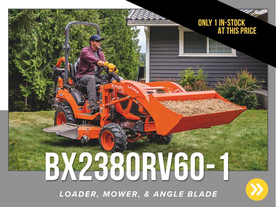 *Customer instant rebates of $4,000 are available on qualifying finance or cash purchases or BX2380 equipment. **0% Down, 5.99% A.P.R. financing for up to 84 months on purchases of select new Kubota BX2380 equipment from participating dealers’ in stock inventory is available to qualified purchasers through Kubota Credit Corporation, U.S.A.; subject to credit approval. Example: 84 monthly payments of $14.60 per $1,000 financed. Some exceptions apply. Offers expires 12/31/2025. Terms subject to change. This material is for descriptive purposes only. Kubota disclaims all representations and warranties, express or implied, or any liability from the use of this material. For complete warranty, disclaimer, safety, incentive offer and product information, see Dealer or go to KubotaUSA.com. †Power (HP/KW) and other specifications are based on various standards or recommended practices.