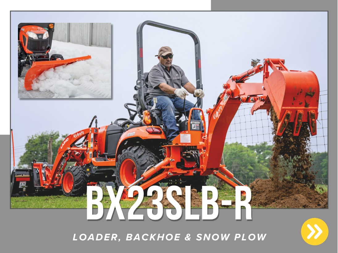 *Customer instant rebates of $5,250 are available on qualifying finance or cash purchases or BX23S equipment. **0% Down, 5.99% A.P.R. financing for up to 84 months on purchases of select new Kubota BX23S equipment from participating dealers’ in stock inventory is available to qualified purchasers through Kubota Credit Corporation, U.S.A.; subject to credit approval. Example: 84 monthly payments of $14.60 per $1,000 financed. Some exceptions apply. Offers expires 12/31/2025. Terms subject to change. This material is for descriptive purposes only. Kubota disclaims all representations and warranties, express or implied, or any liability from the use of this material. For complete warranty, disclaimer, safety, incentive offer and product information, see Dealer or go to KubotaUSA.com. †Power (HP/KW) and other specifications are based on various standards or recommended practices.