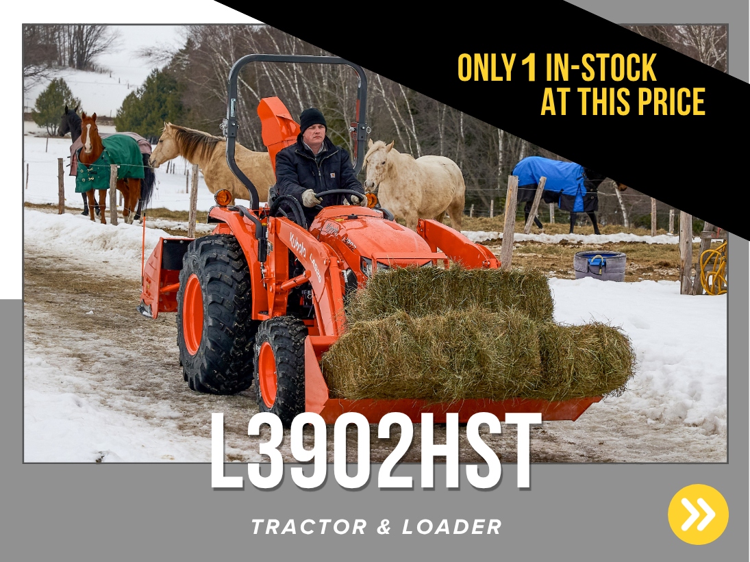 *Customer instant rebates of $3,500 are available on qualifying finance or cash purchases or L3902 equipment. **0% Down, 5.99% A.P.R. financing for up to 84 months on purchases of select new Kubota L3902 equipment from participating dealers’ in stock inventory is available to qualified purchasers through Kubota Credit Corporation, U.S.A.; subject to credit approval. Example: 84 monthly payments of $14.60 per $1,000 financed. Some exceptions apply. Offers expires 12/31/2025. Terms subject to change. This material is for descriptive purposes only. Kubota disclaims all representations and warranties, express or implied, or any liability from the use of this material. For complete warranty, disclaimer, safety, incentive offer and product information, see Dealer or go to KubotaUSA.com. †Power (HP/KW) and other specifications are based on various standards or recommended practices.